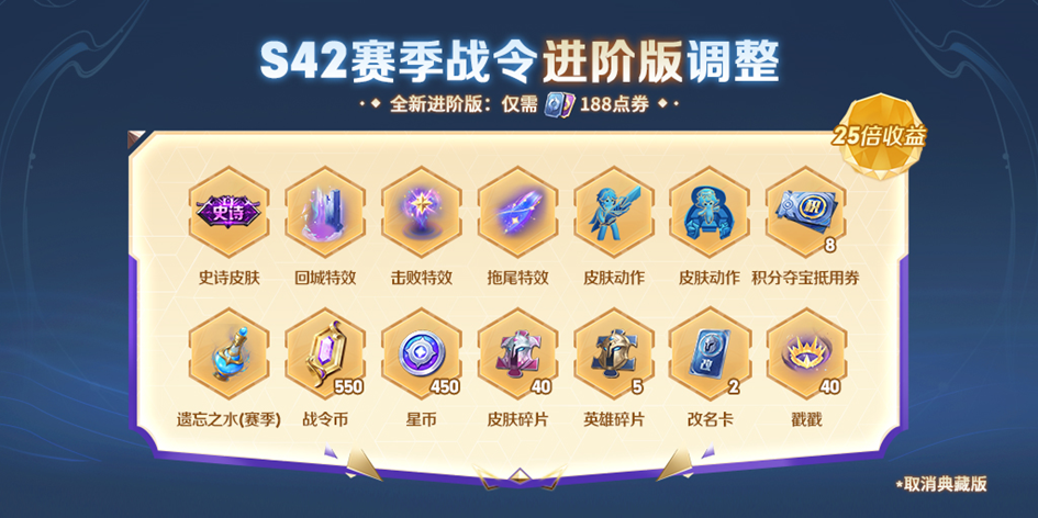 新版本战令战令下赛季将会升级为“赛季战令”,价格降至188点券,同时取消了典藏版本,玩家担心的祈光之泉皮肤,放在了75级的奖励中。