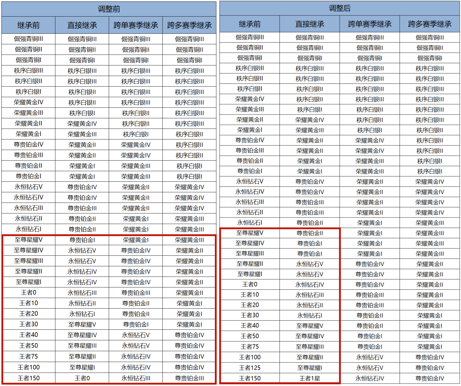 新赛季的排位继承有变,从星耀到王者150星均有变化,新增了125星可继承星耀1,同时150星可以直接到王者1星,相当于有了一个掉段的保护卡。