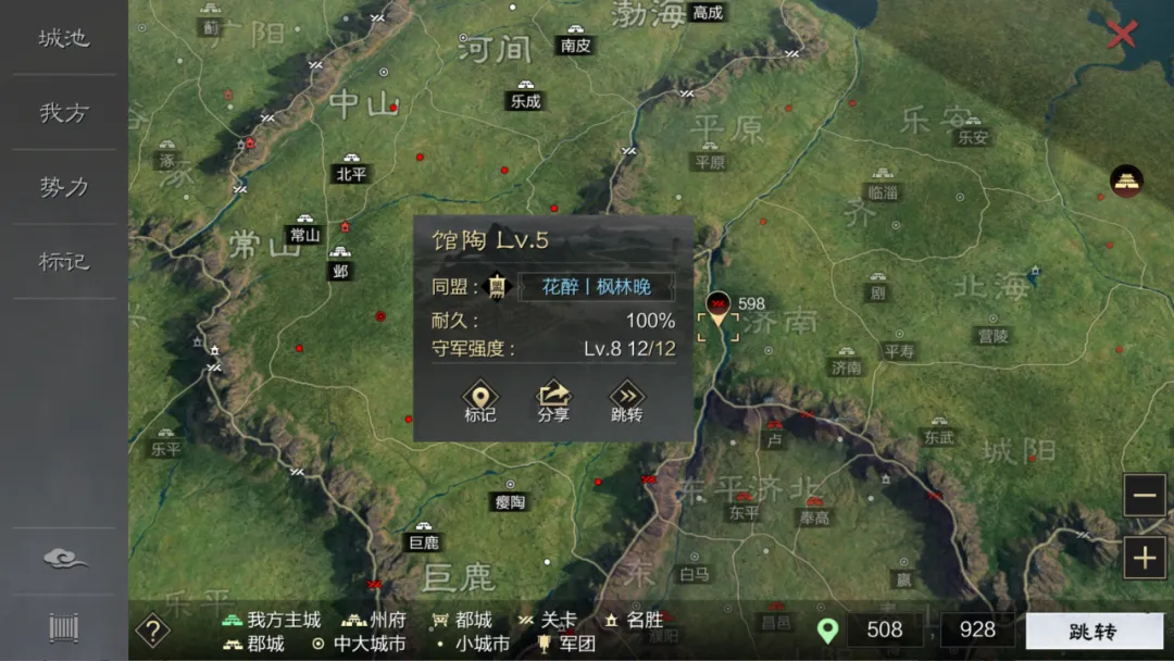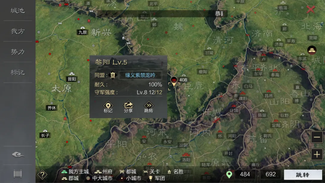 然而榜单位次只是实力的冰山一角,真正的较量已在关隘处悄然展开:【花醉丨枫林晚】攻占青冀关隘【馆陶】直指冀州,与当地霸主【缘义紫禁龙吟】正面对峙;【缘义紫禁龙吟】也于今晨攻占黎阳,与并州的【申丨风华绝代】两军对垒,旌旗相望,跨州交锋似是一触即发!