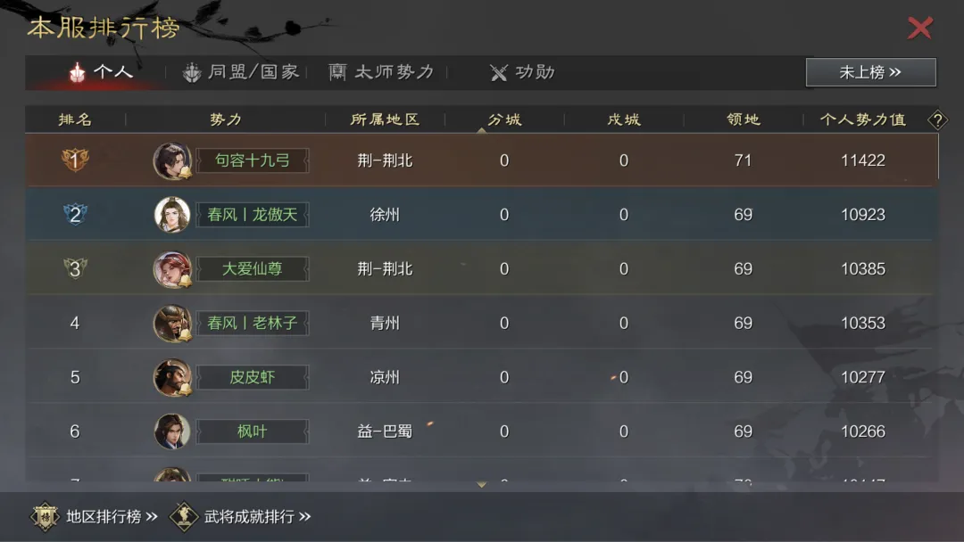 个人排行榜上,荆州“句容十九弓”以11422势力值一骑当先,徐州“春风丨龙傲天”、荆州“大爱仙尊”等多位主公紧随其后,势力值均在10000出头,竞争相当激烈,这片土地上的每一位主公,都在用自己的方式,为即将到来的乱世积蓄力量。