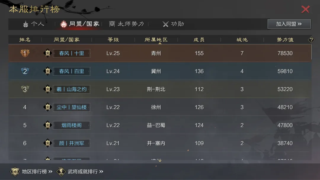 开服48小时同盟排行榜上,以“春风”为前缀的同盟【春风丨十里】和【春风丨百里】占据前二,稳据青州和冀州,荆州【羲丨山海之约】跻身三甲。