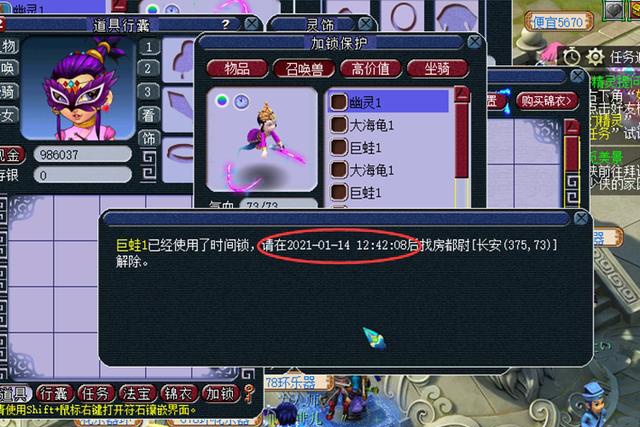 宝宝仓库被填满,毫无疑问都是大海龟与巨蛙。最为关键的是,宝宝身上都有"时间锁",当玩家尝试着解锁时,提示"请在2021年1月14日后找房都尉解除",看到这个消息,玩家内心相当郁闷。想要将这些大海龟、巨蛙全部放生,还要等待明年?这游戏还能玩下去吗?香、蜡烛这些东西都可以解锁,但时间锁似乎没有办法,事情到了这一步,难道只能重新上架吗?