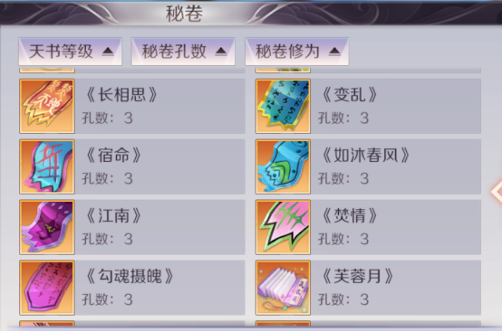 2、掌控中的天书,可以进行秘卷衍化,根据天书等级的不同,可以衍化秘卷的孔数也不同。六级天书五个孔;五级天书四个孔;四级天书三个孔;三级天书两个孔;1-2级天书一个孔。