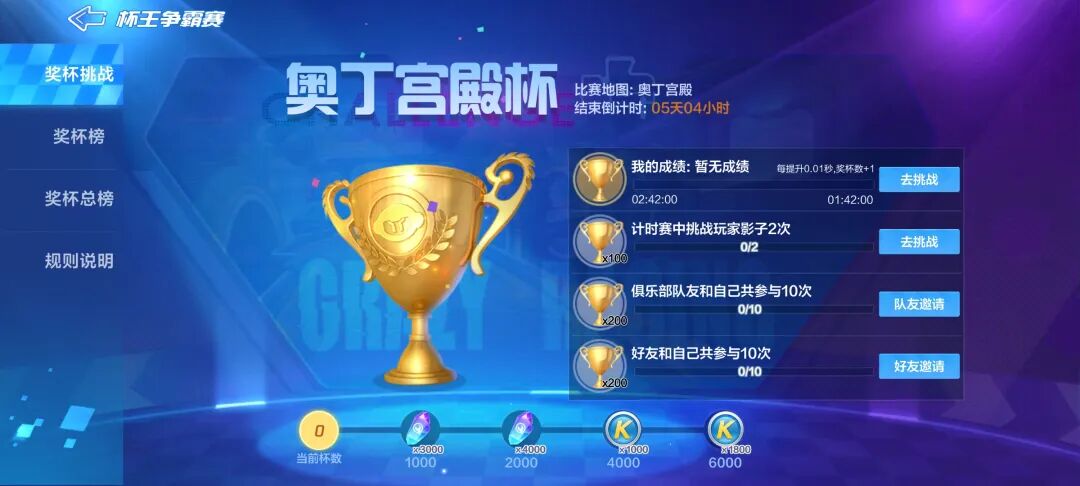 活动期间,车友们可通过完成活动的对应任务获得奖杯,用以兑换能量水晶和酷币。另外,奖杯总榜结算时前三名车友,更可获得对应赛道的车牌和赛车抵金券