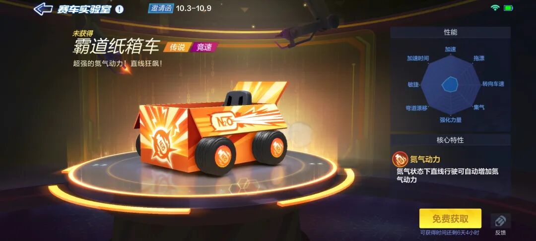 霸道纸箱车-核心特性【氮气动力】:氮气状态下直线行驶可自动增加氮气动力。同时使用霸道纸箱车完成活动,还可领取专属车贴等珍稀奖励!