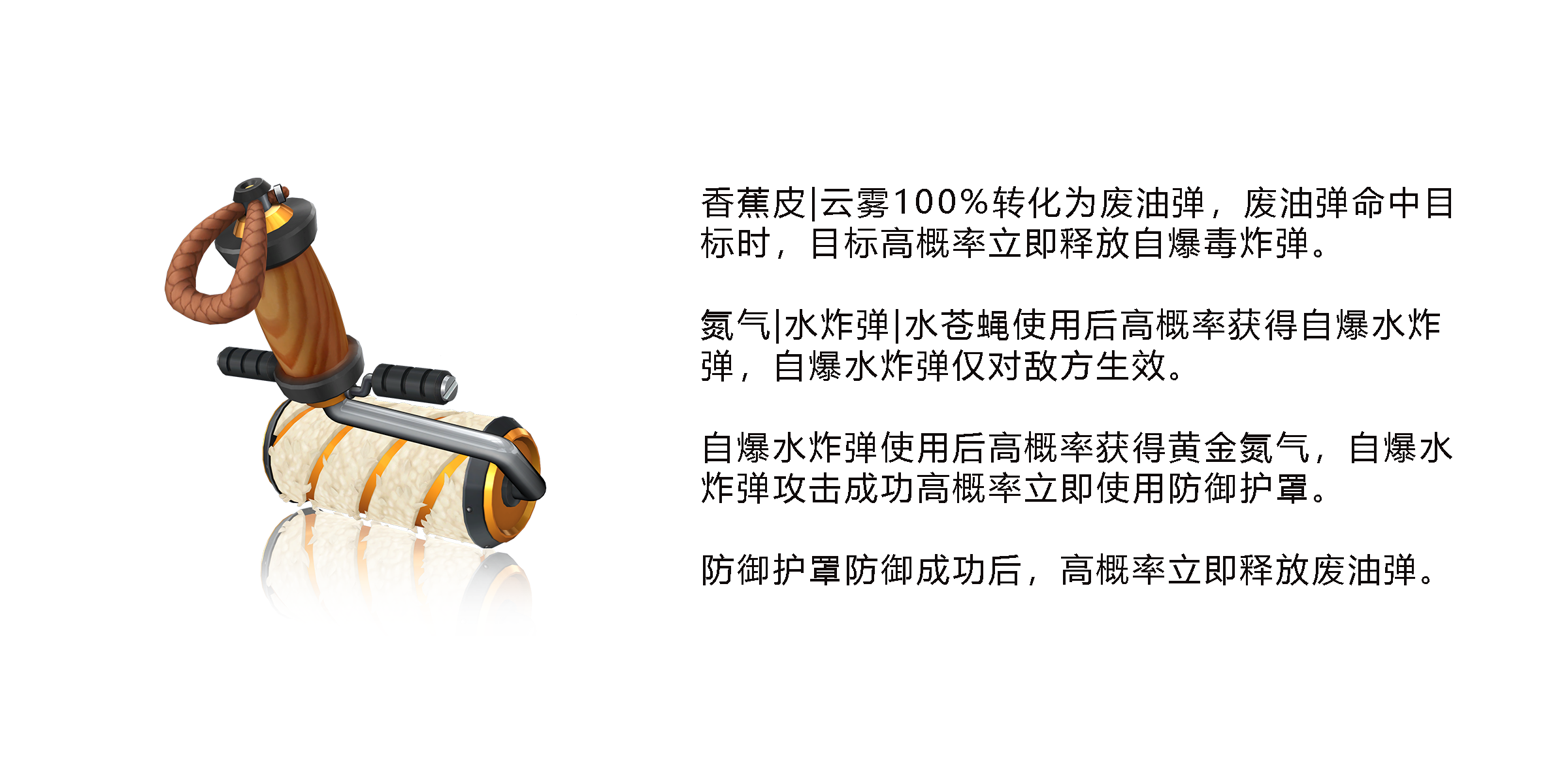 60%概率防御大魔王、闪电、巨熊之怒、吞噬大魔王50%概率被自爆冰炸弹、冰冻水炸弹命中获得狗狗氮气