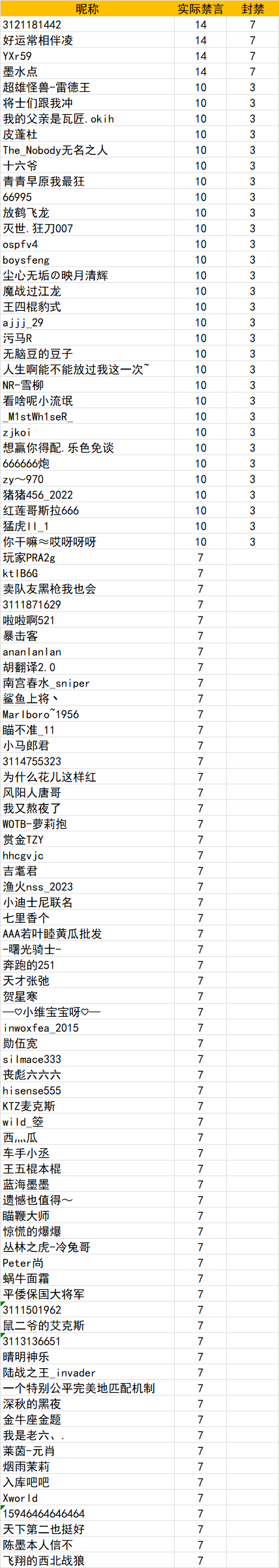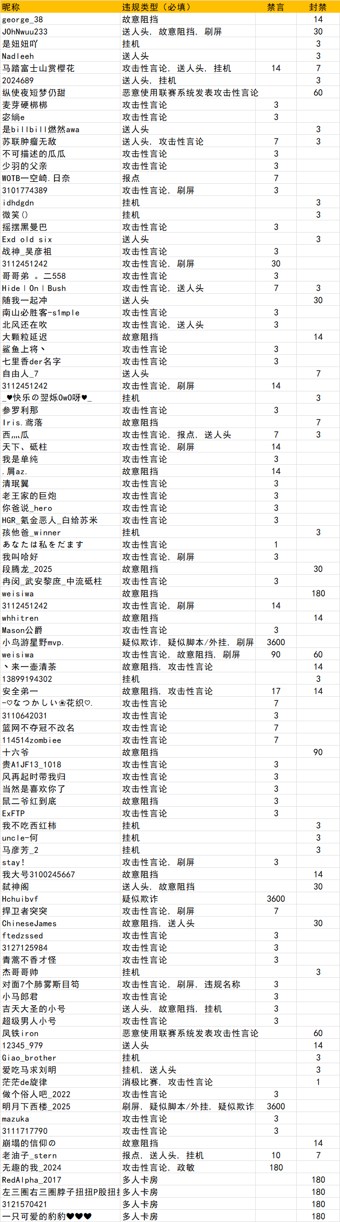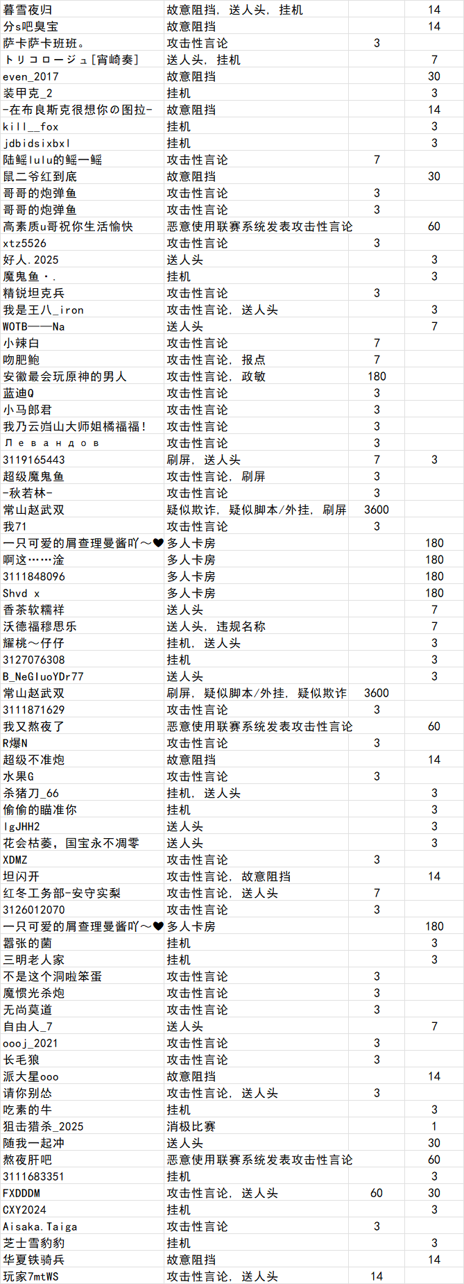 近期我们在社区及游戏内接到了大量举报反馈,游戏内部分玩家存在违规行为,经核查,将对以下玩家做出相应处理,请车长审批。