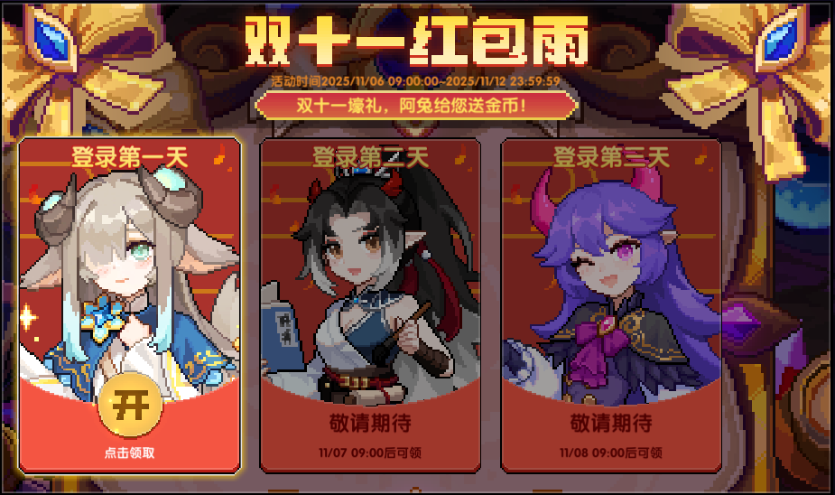 Tips: 本期双十一活动总共可免费领取双十一金币x66,折扣券可用于双十一商城指定礼包