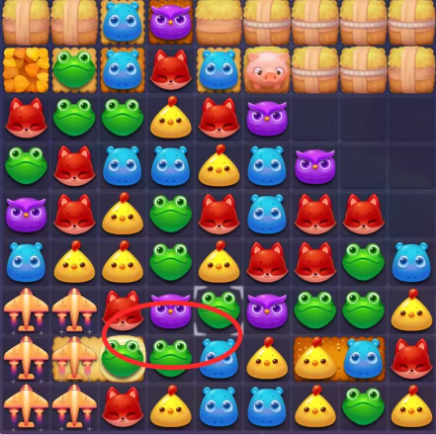 3:旁消消除击打小飞机,配合直线特效等助力消除顶部的草垛,激活小猪可加速消除周边草垛