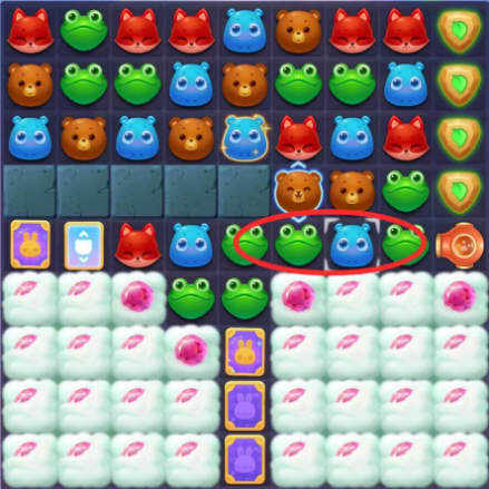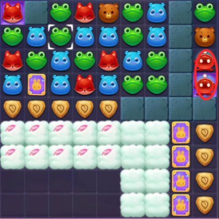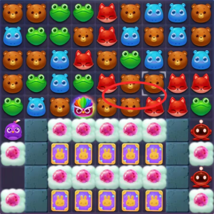 3:旁消击打魔法石助力消除下方云团,动物掉落后交换染色宝宝,产出大量的特效辅助消除周边云团