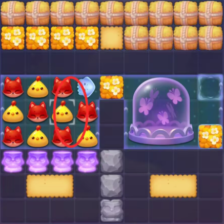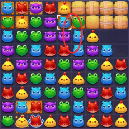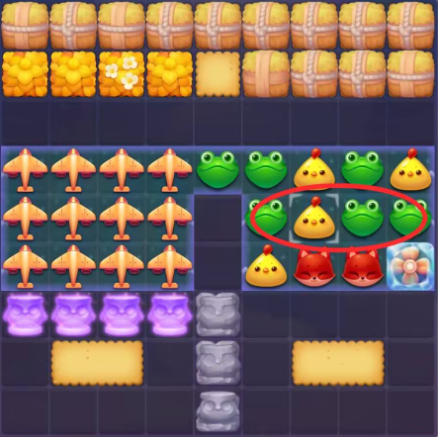 4:收尾时以贴边三消消除为主,优先对顶部草垛进行消除,制作蛋糕是采用三消消除为主,也可组合特效进行辅助消除,剩余蛋糕的制作进度同步进行