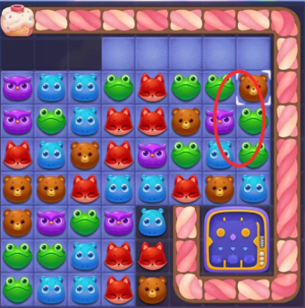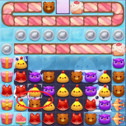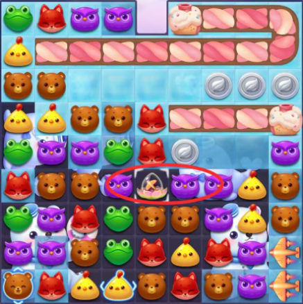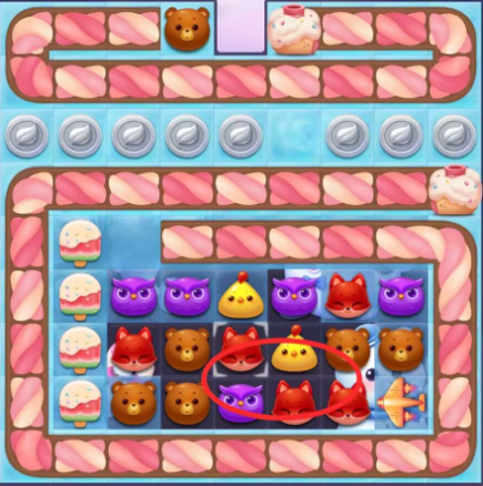 1:三消消除击打棉花糖,消除棉花糖扩大棋盘消除空间,同时动物掉落填充助力消除周边的雪块