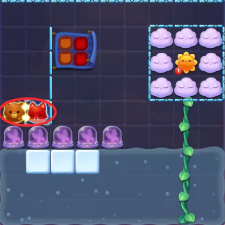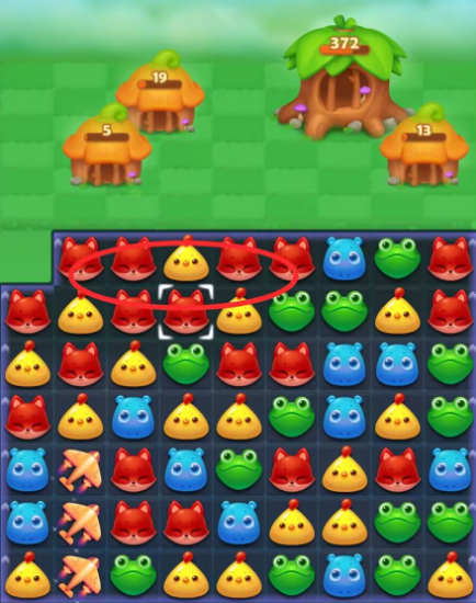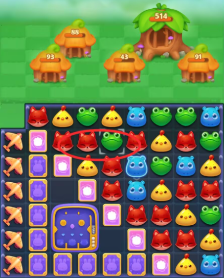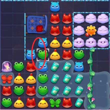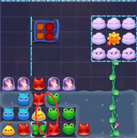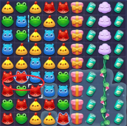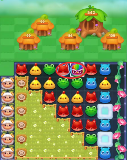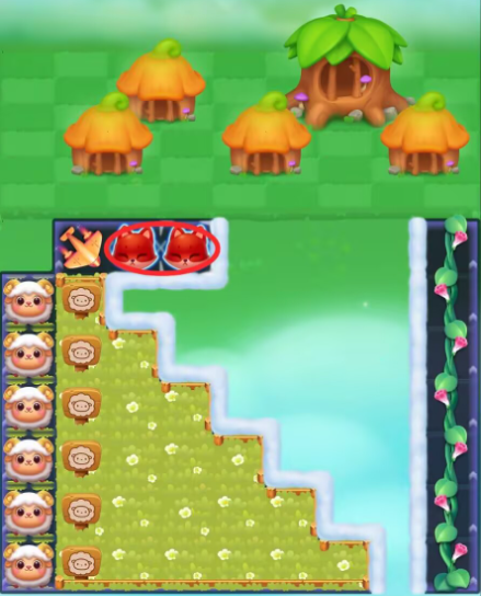2:采用贴边三消消除或者组合特效进行助力,击打激活花藤送左侧咩咩羊进入羊圈