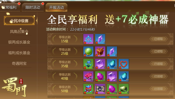 缤纷活动,助阵新服,活动期间只要玩家登录《蜀门手游》便可领取仙灵礼包,绑银紫云石等奖励,更有高阶主法宝,专属限定称号等稀有大礼。有了趁手的兵器何愁江湖路远呢。全名冲级战力比拼等活动限时开启,蝶恋花礼包,七彩晶钻等超值豪礼惊喜掉落,更有超稀有道具青龙印记凤凰令,又有谁不想拥有羡煞众人的龙凤坐骑呢?