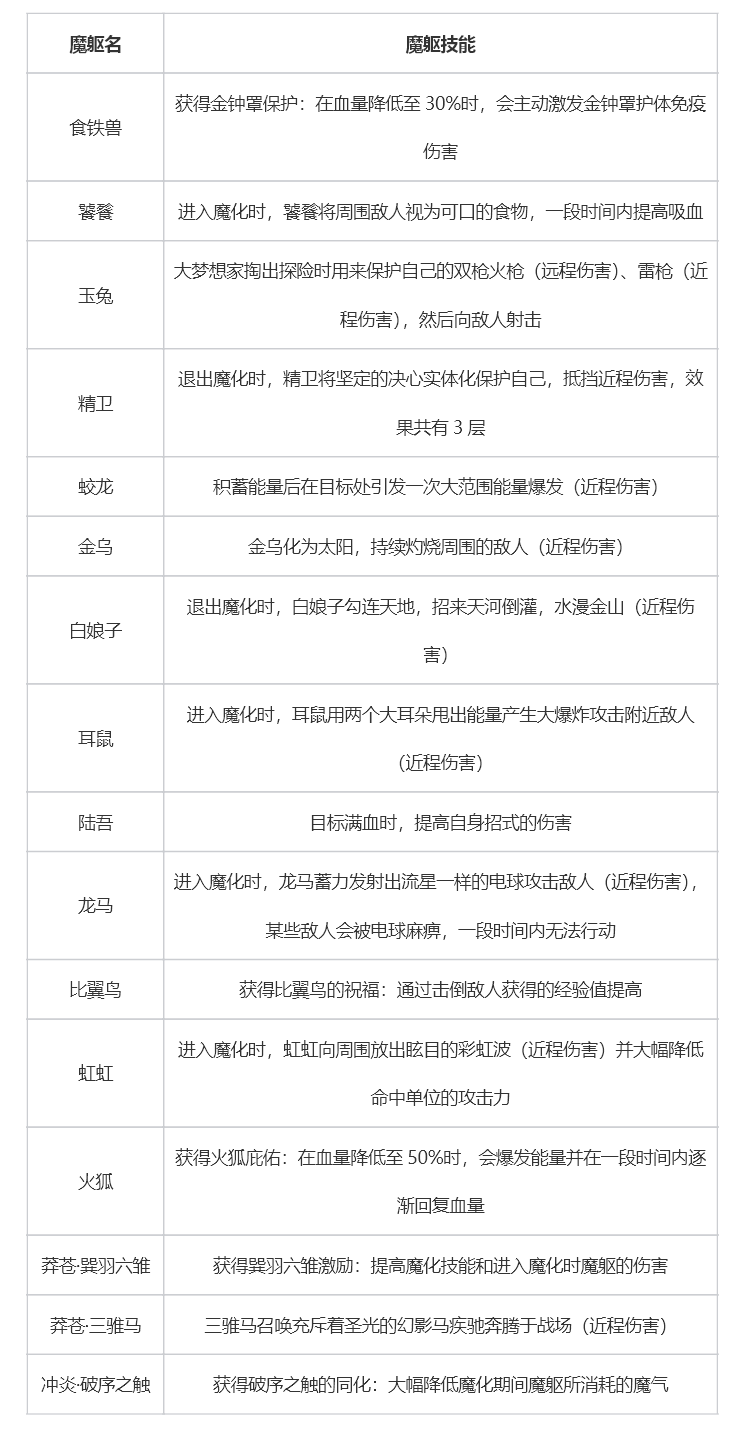 三、不同宠物的魔化技能第一批开放魔躯的宠物包含了部分进化宠和部分野生宠,它们的魔躯技能如下表: