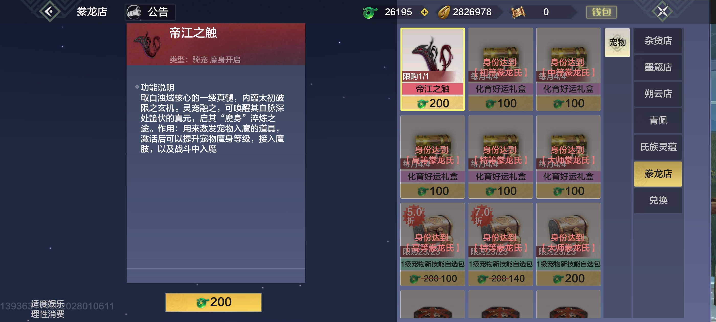 宠物魔化需要满足2个条件:①宠物年份达到万年;②使用【帝江之触】激活魔身。