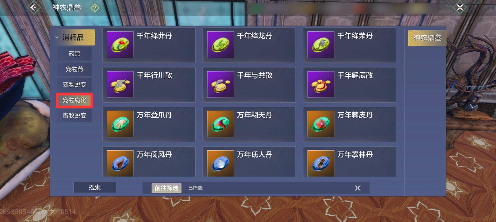 旅者可在【神农鼎-宠物魔化】处制作转煞丹、查看对应配方需求。