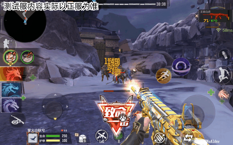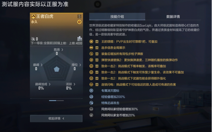 王者白虎技能兼顾PVP、挑战模式。在PVP对战中,它拥有王者武器基本的王的馈赠技能,出生时可向队友馈赠该武器且效果能叠加。另外装备后增加所有背包步枪子弹能,提升了步枪续航。