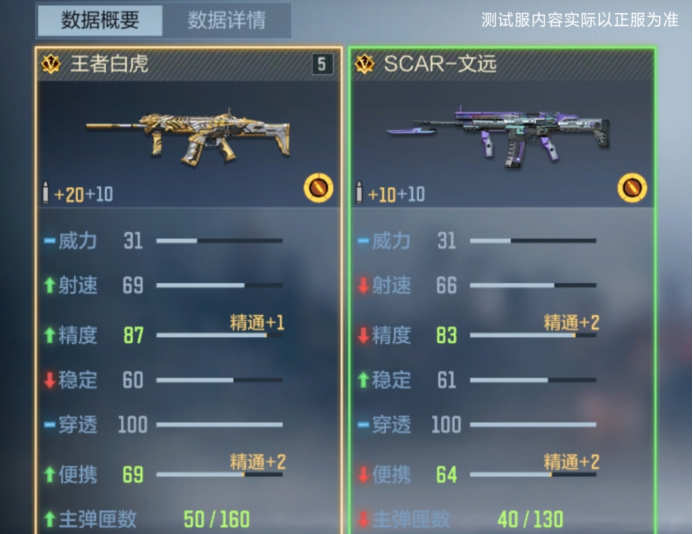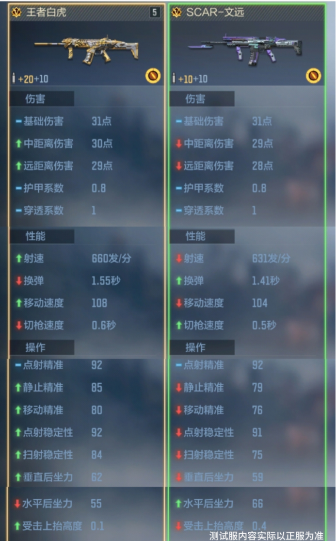 伤害表现上,二者基础伤害同为 31 点,但王者白虎中距离伤害 30 点、远距离伤害 29 点,分别比 SCAR - 文远高出 1 点,距修的优化使得王者白虎可以在中远距离对枪时能打出更高伤害,压制力更强。