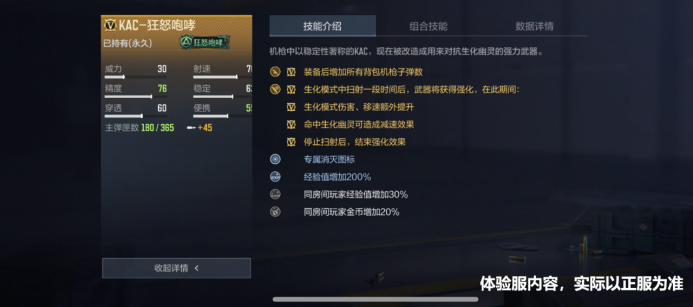 技能方面,配置了“装备后增加所有背包机枪子弹数“和”生化模式中扫射一段时间后,武器将获得强化,在此期间:生化模式伤害、移速额外提升;命中生化幽灵可造成减速效果;停止扫射后,结束强化效果”的特殊属性,这些属性,无疑是我们征战生化战场的强大助力。