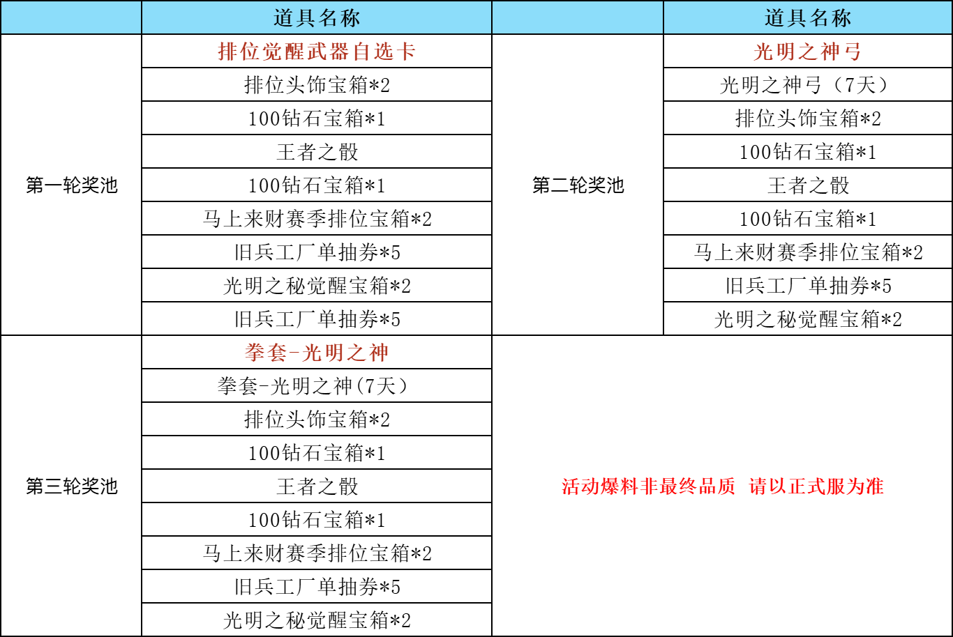 光明幸运卡活动分为三轮奖池,第一周登录领【皮肤】81式-光明之神-三足金乌,这款皮肤并非首发,上次没有搞到的玩家这次可要把握住机会!第二周登录领【皮肤】光明之神弓-三足金乌,第三周登录领【皮肤】拳套-光明之神-三足金乌。三周登录直接免费获取光明之神-三足金乌皮肤套装。三轮奖池如下图: