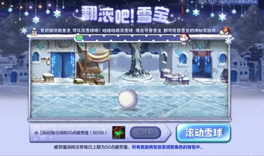 12月17日-1月14日,“翻滚吧!雪宝”活动开启,当玩家消耗完50点疲劳值时,前往“翻滚吧!雪宝”活动界面,可领取1个雪球滚动能量值,多次滚动雪球并完成堆雪人后,可获得神秘小礼物。