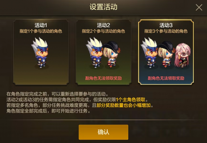 需要注意的是,本次活动中,玩家指定多个角色参与活动时,勇士需选定1个可获得奖励的角色,其他角色仅为辅助完成任务。在参与活动时,玩家是先选择要参与活动的角色数量,再指定具体的角色。