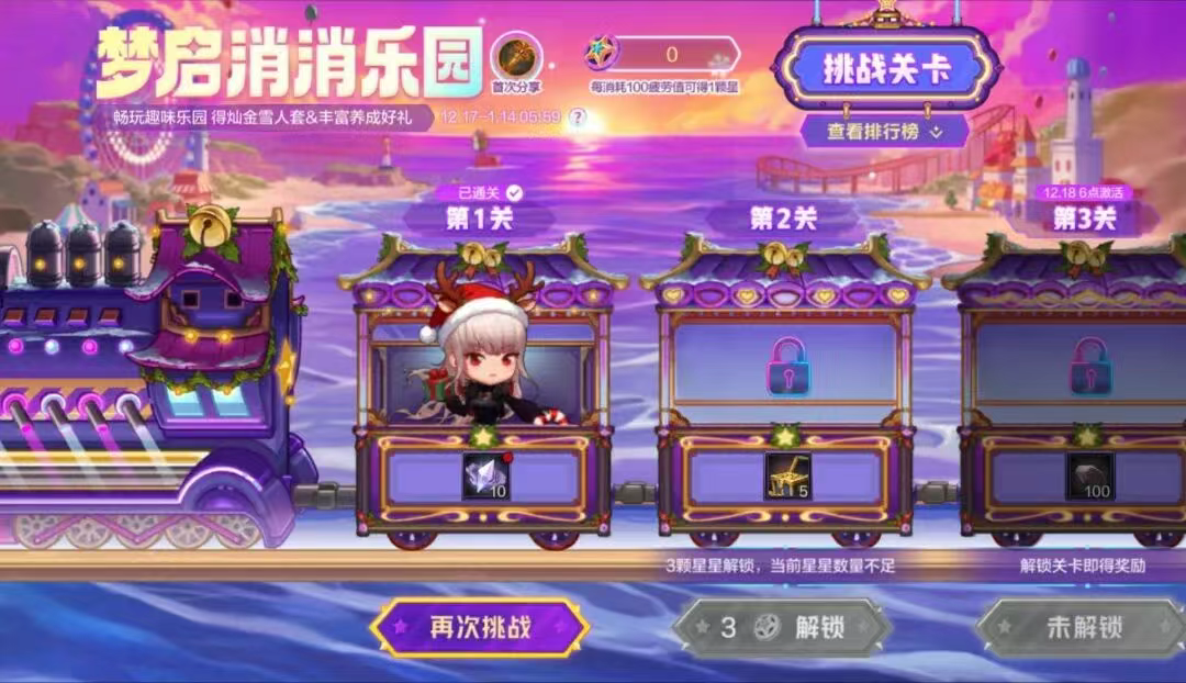 12月17日-1月14日,“梦启消消乐园”活动开启,活动期间,玩家参与趣味消除类玩法,消耗疲劳值获得积分,解锁普通关卡并获取活跃奖励,奖励包括矛盾的结晶体(账号绑定)、宇宙精华礼盒(账号绑定)、幸运符(账号绑定)、1阶属强白金徽章自选礼盒(账号绑定)、征讨地区发电适配器礼盒(1个)、斯卡迪的印章(账号绑定)、 灿金雪人装扮礼盒等。