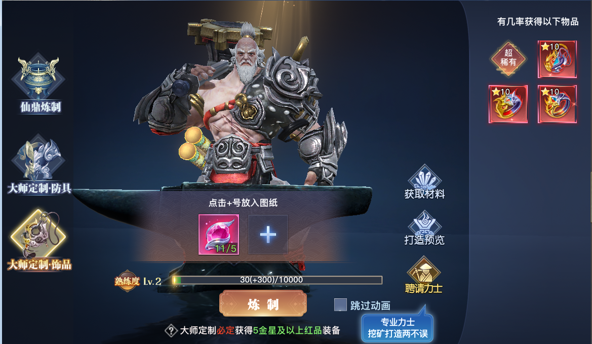 在打造炉中放入3-5块矿石,即可打造仙魔装备,获得的部位是随机的哦。小编是习惯放入5块,成功率高些。但这个见仁见智,有些小伙伴喜欢小熊割大树,以小博大放入3个也是可以的,要是一不小心出个神装,岂不是赚大发了!