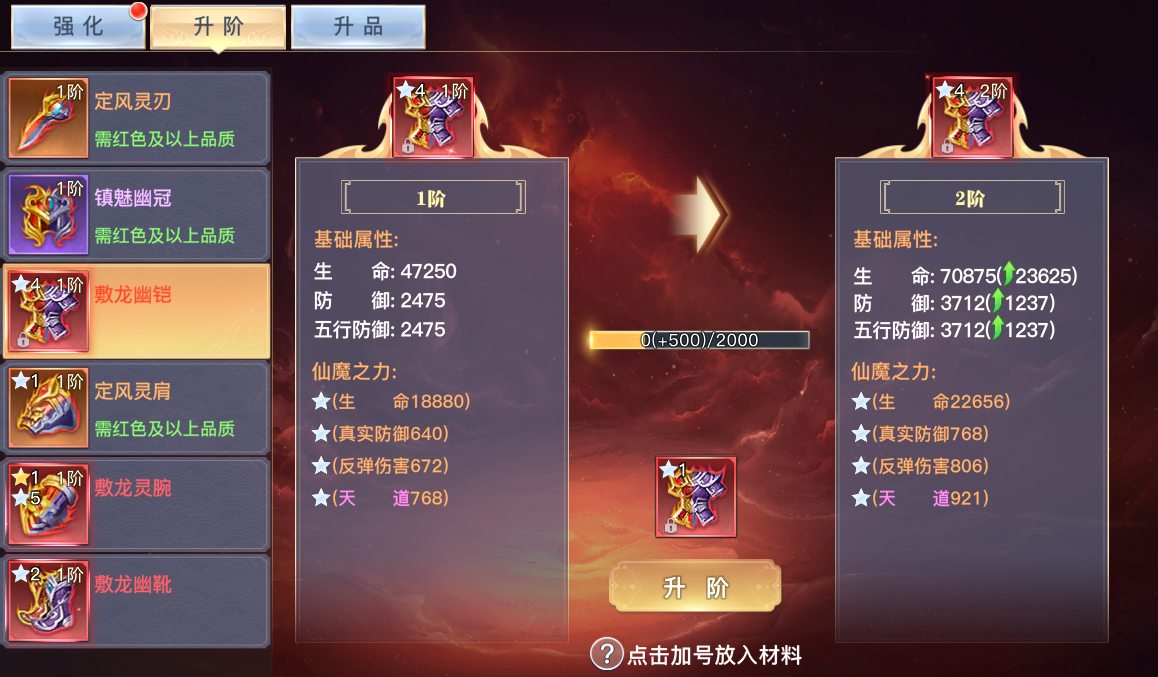只有红色及以上品质的仙魔装备方可进行升阶。需要消耗仙魔升阶精魄或红色及以上品质的仙魔装备获得升阶经验,提升阶数能百分百提升仙魔装备基础属性和仙魔之力。红色品质仙魔装备上的金星可额外提供升阶经验,金星数 越多,提供的升阶经验越多。