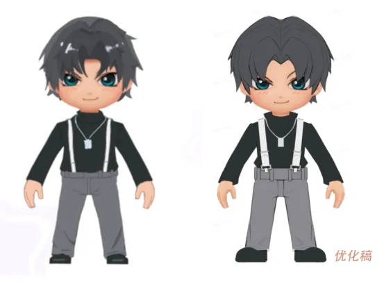 优化发型色彩、增加背部背带、统一材质,以确保设计还原与结构美观。