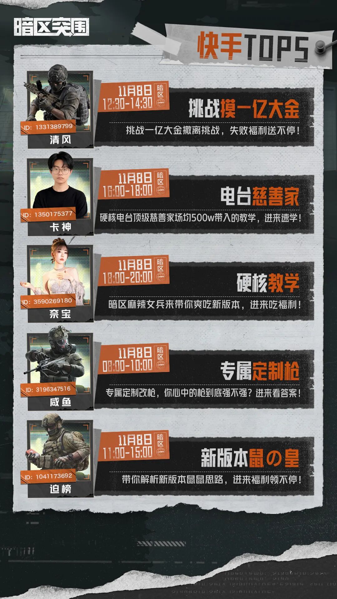 11月8日-11月9日,人气主播、电台高手、刚枪软妹齐聚一堂,带你熟悉硬核电台,教你各种保险点位!直播间更有机密文件、理想国、金狮雕像等宠粉福利掉落!