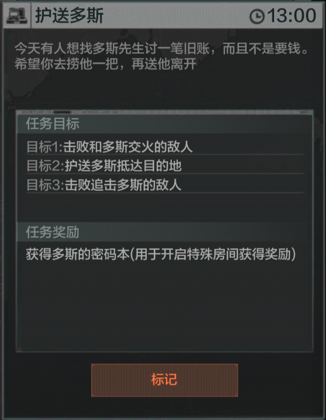 多斯本人需要你紧急护送他撤离!开局12分钟后才可接取该任务,该任务的终端机位置将固定出现在诺昂斯庭院。