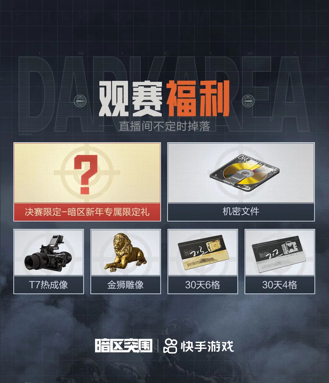 观赛还有福利!机密文件、金狮、安全箱等海量游戏道具福袋随机掉落!锁定决赛还有暗区新年专属限定礼!