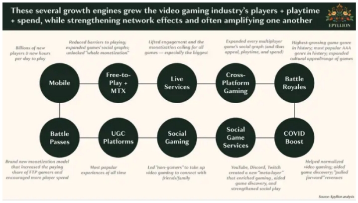 海外分析师Matthew Ball在其2025年游戏行业报告中提到,上一个周期促进游戏市场增长有十大增长引擎,如移动游戏、免费游玩+内购、持续运营、跨平台、战术竞技、赛季通行证、UGC平台、社交游戏、社区运营。