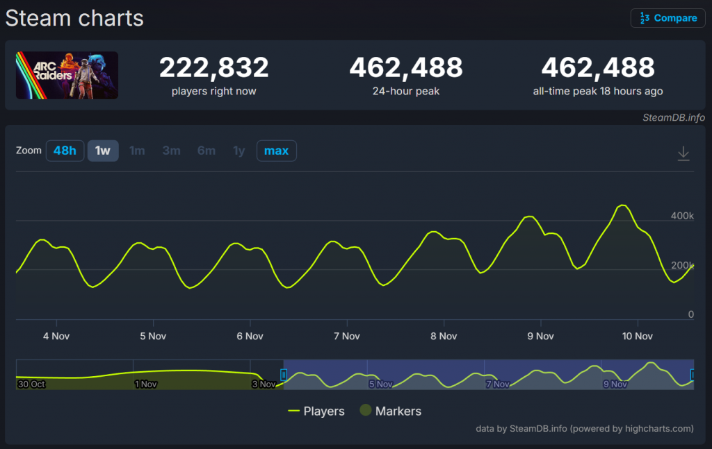 将视野放宽,《逃离鸭科夫》的崛起并非孤例。纵观今年的射击游戏市场,整体呈现全面发力、竞争升级的态势。例如在11月9日,备受期待的科幻射击游戏《ARC Raiders》同时在线人数峰值一举达到46.2万人,展现出同类产品对全球玩家的强大吸引力。在这个充满活力的赛道中,无论是《逃离鸭科夫》凭借创意与社区异军突起,还是《ARC Raiders》依托传统大作声势进场,都共同预示着射击游戏品类正迎来一个创新与增长并存的黄金时期。
