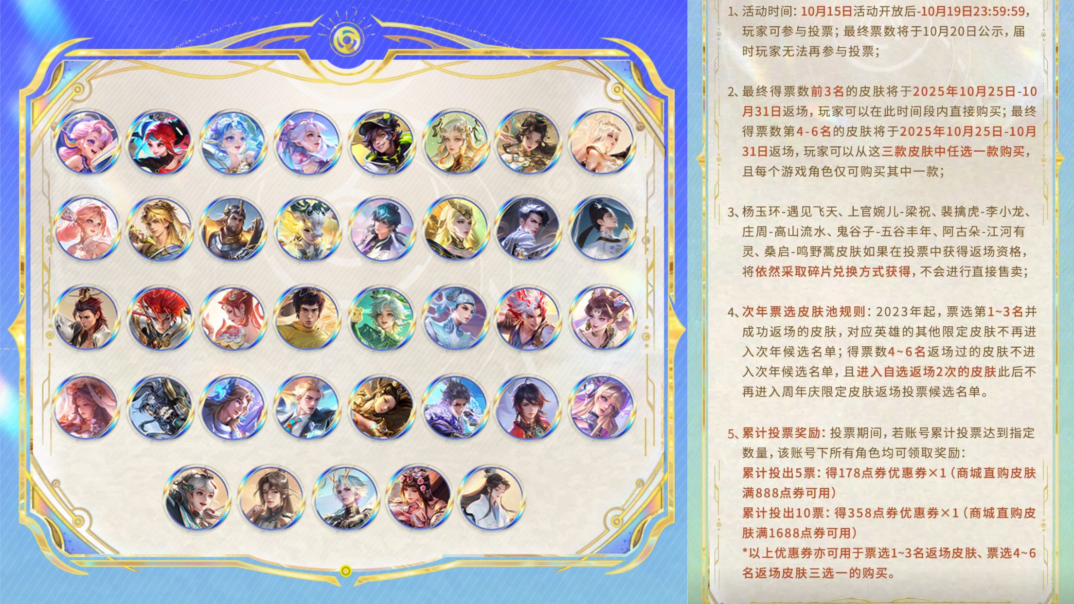 15号限定皮肤返场投票活动也会开启,官方已经公布了这次的投票池,如下图所示,总共有37款限定皮肤进入其中。