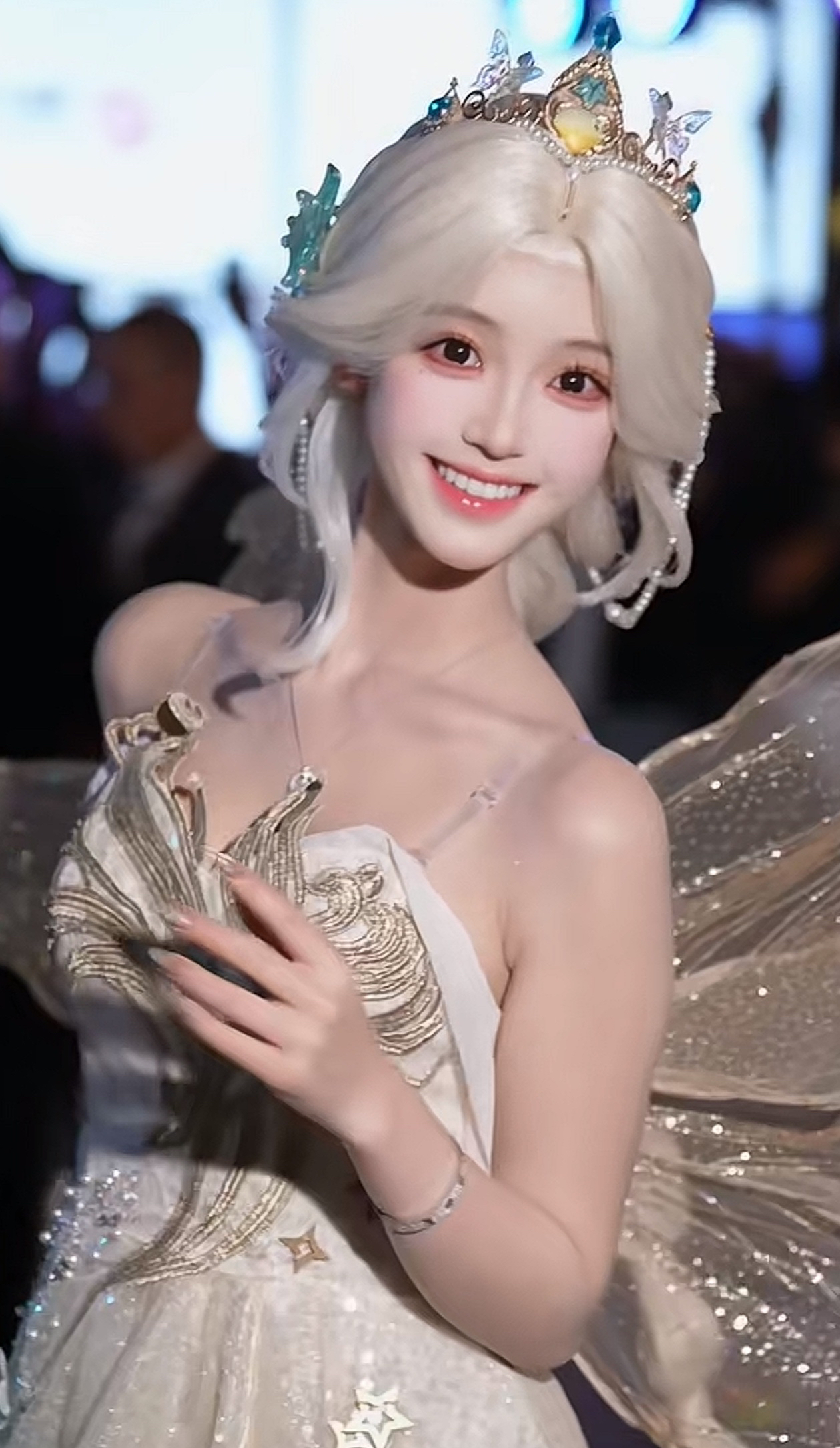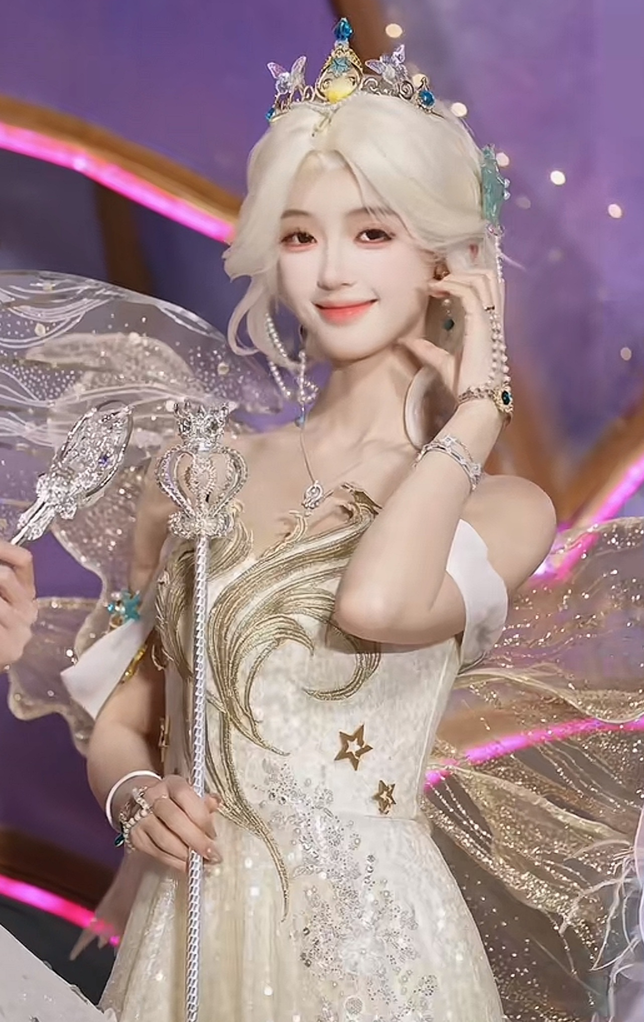 而且,她的这条白色裙子上面还有闪闪发光的亮片,再加上星星样式的挂坠,看着就很不错。而且,她身后还戴着一对透明的翅膀,让她的这个造型就更完美了。并且,她穿着这条白色的裙子,锁骨非常明显,看着很不错,身材超级好。