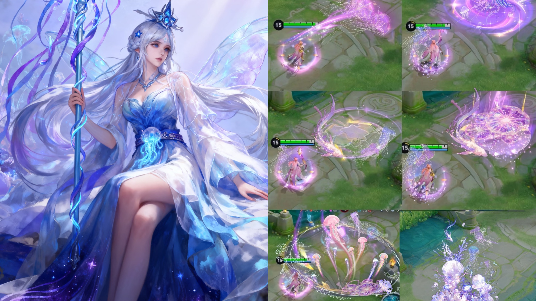 如下图所示,这款皮肤的局内特效颜色以紫色为主,特效中包含水母、珊瑚、贝壳等海洋元素。