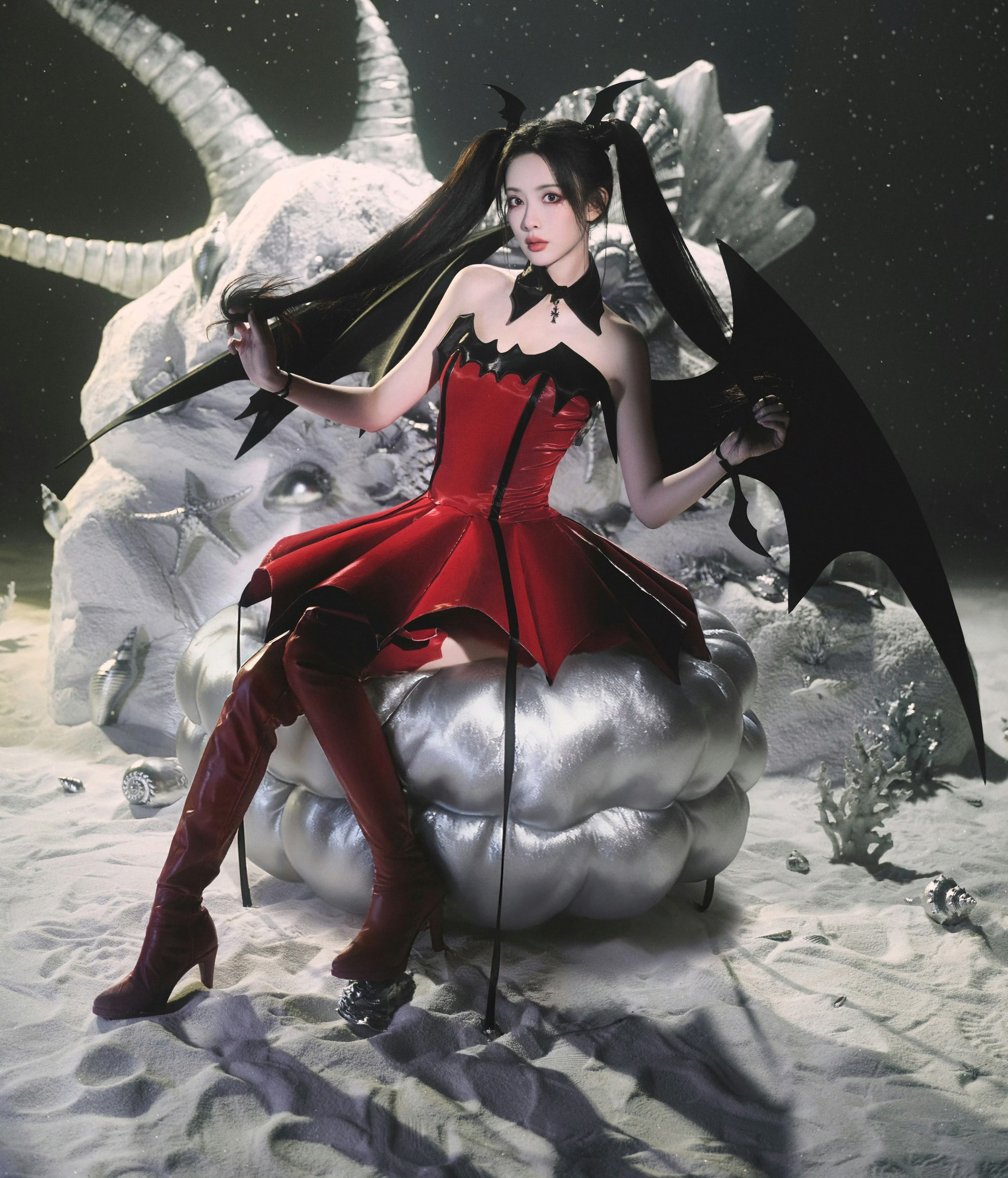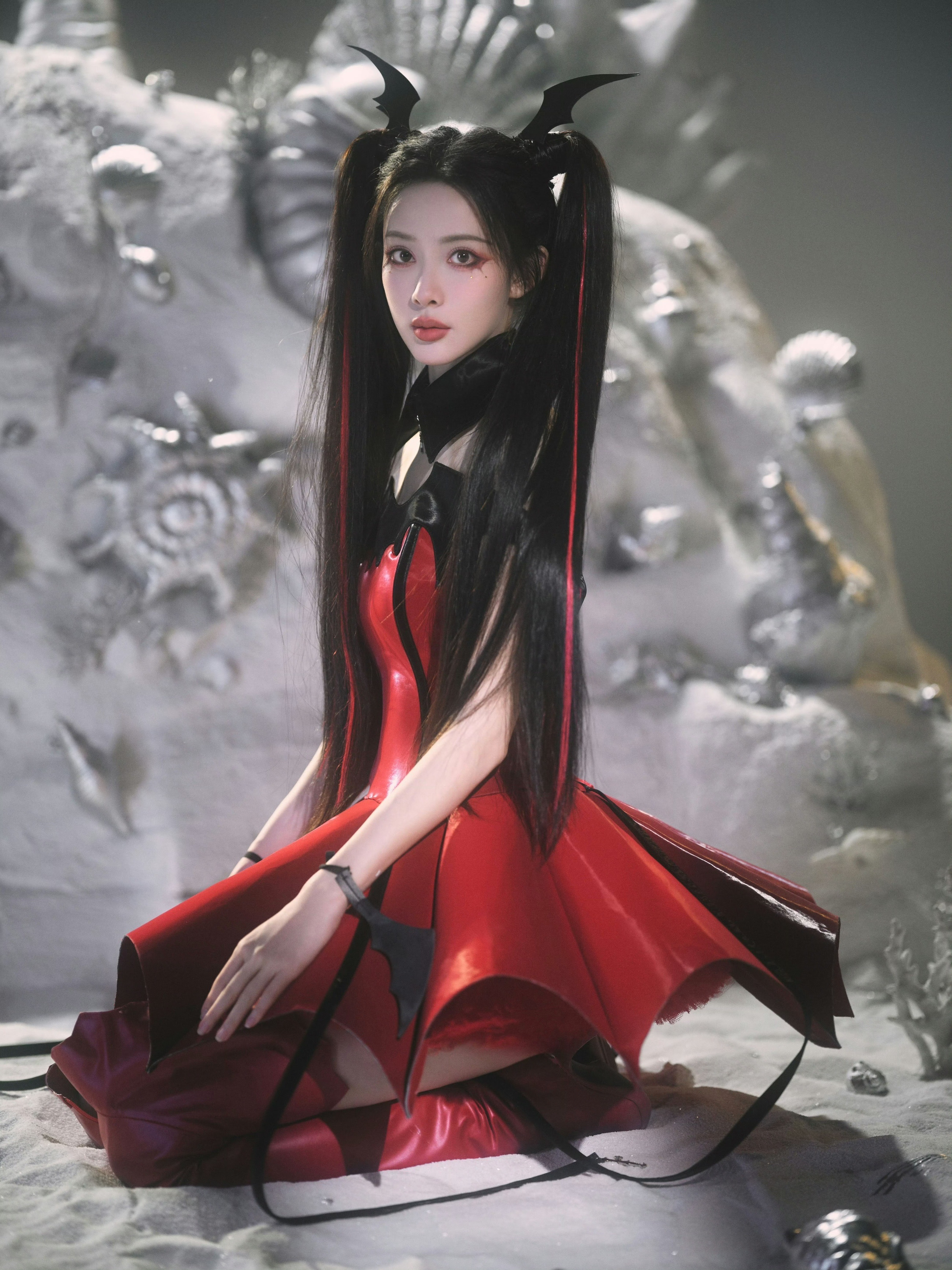 能看到她拍摄的这组cos作品的地点像是在一个星空中,她坐在一个银色的巨型怪兽上面,很独特。身后竟然还有一对黑色的恶魔翅膀,也是为她这个造型增加了一些独特性。