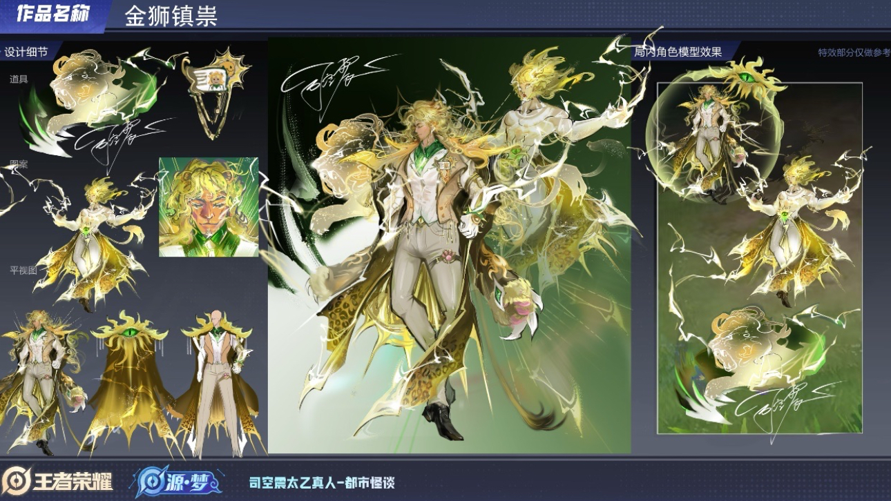 目前已经有不少玩家进行了投稿,如上图所示,这是一位玩家给司空震设计的源梦皮肤方案,叫做金狮镇祟。这个方案倒是挺契合司空震的,但是设计的美感差了些,之后想要脱颖而出很难。
