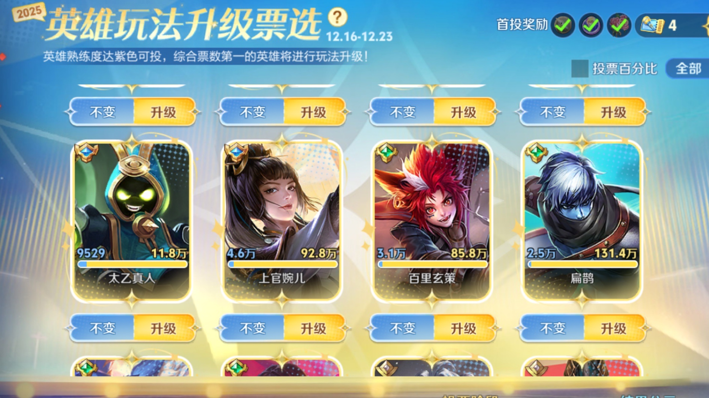 近期王者荣耀还开启了一个英雄投票活动,让玩家给一部分冷门英雄进行投票,票数最高的英雄,在明年就会获得玩法升级。