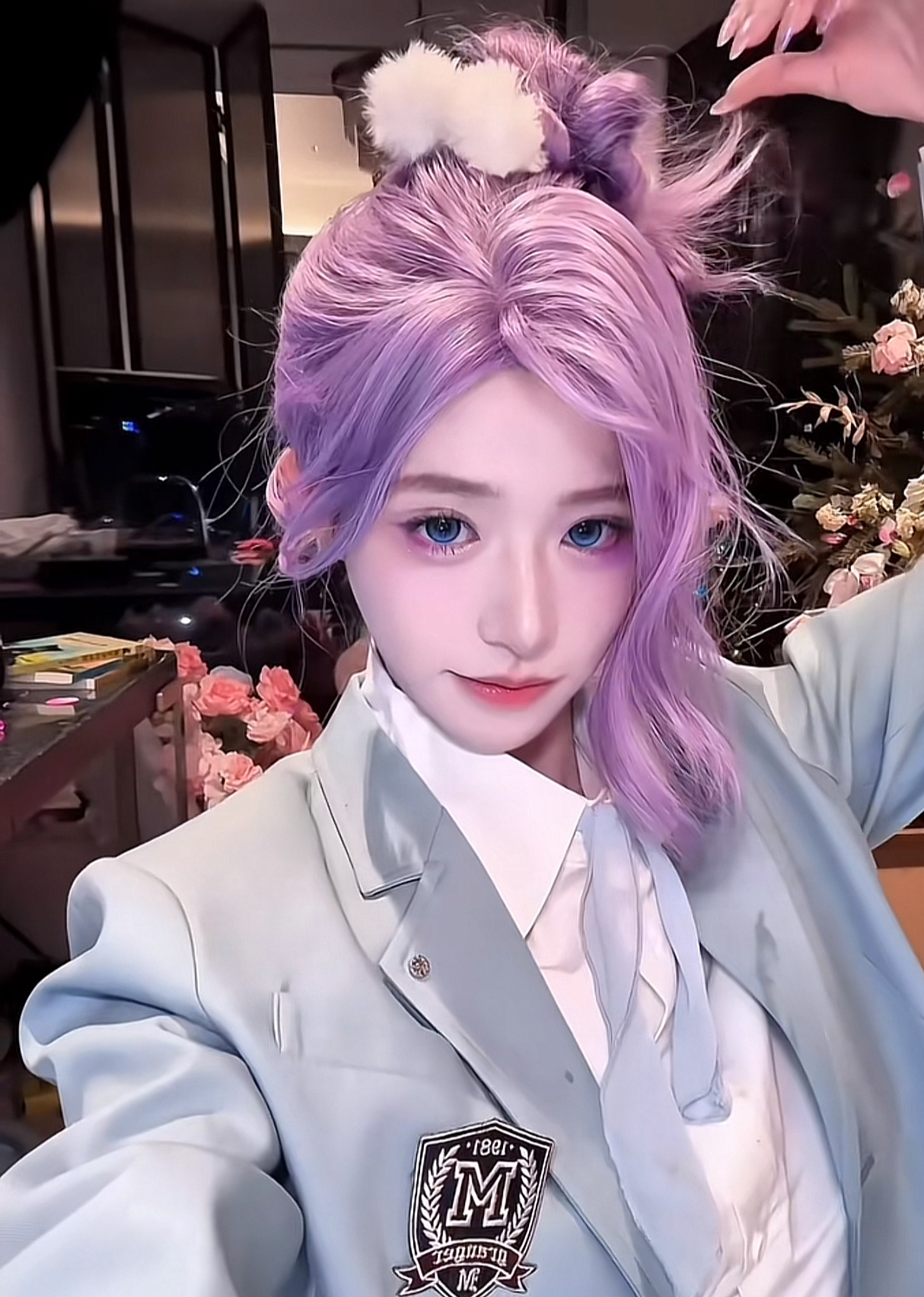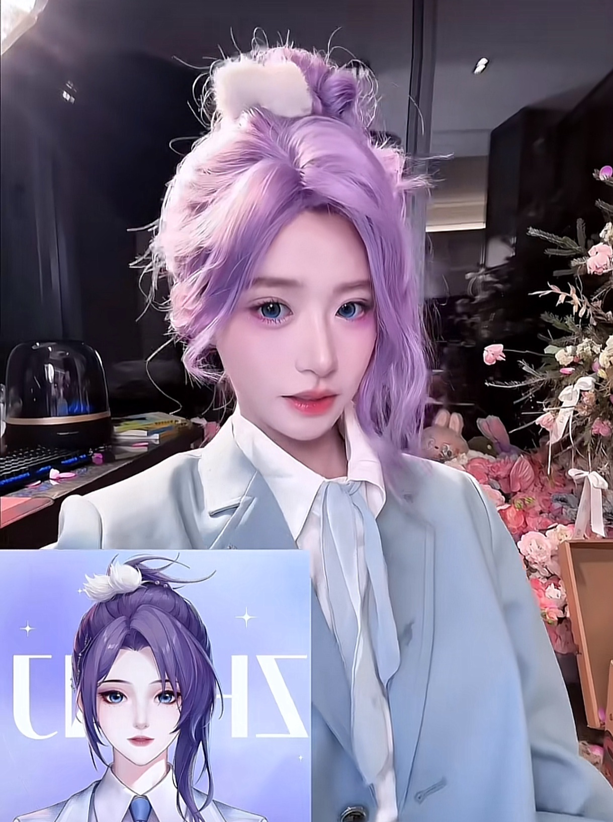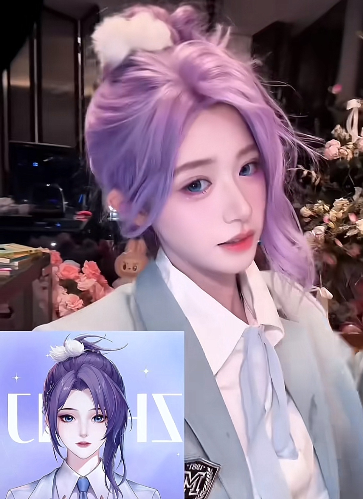 能看到,花碎花身穿一件白色的T恤,外套是浅蓝色的小西装外套,领口处还有随意扎起的蝴蝶结,再搭配她还戴着一头紫色的假发,假发扎的高高的,看起来很不错。