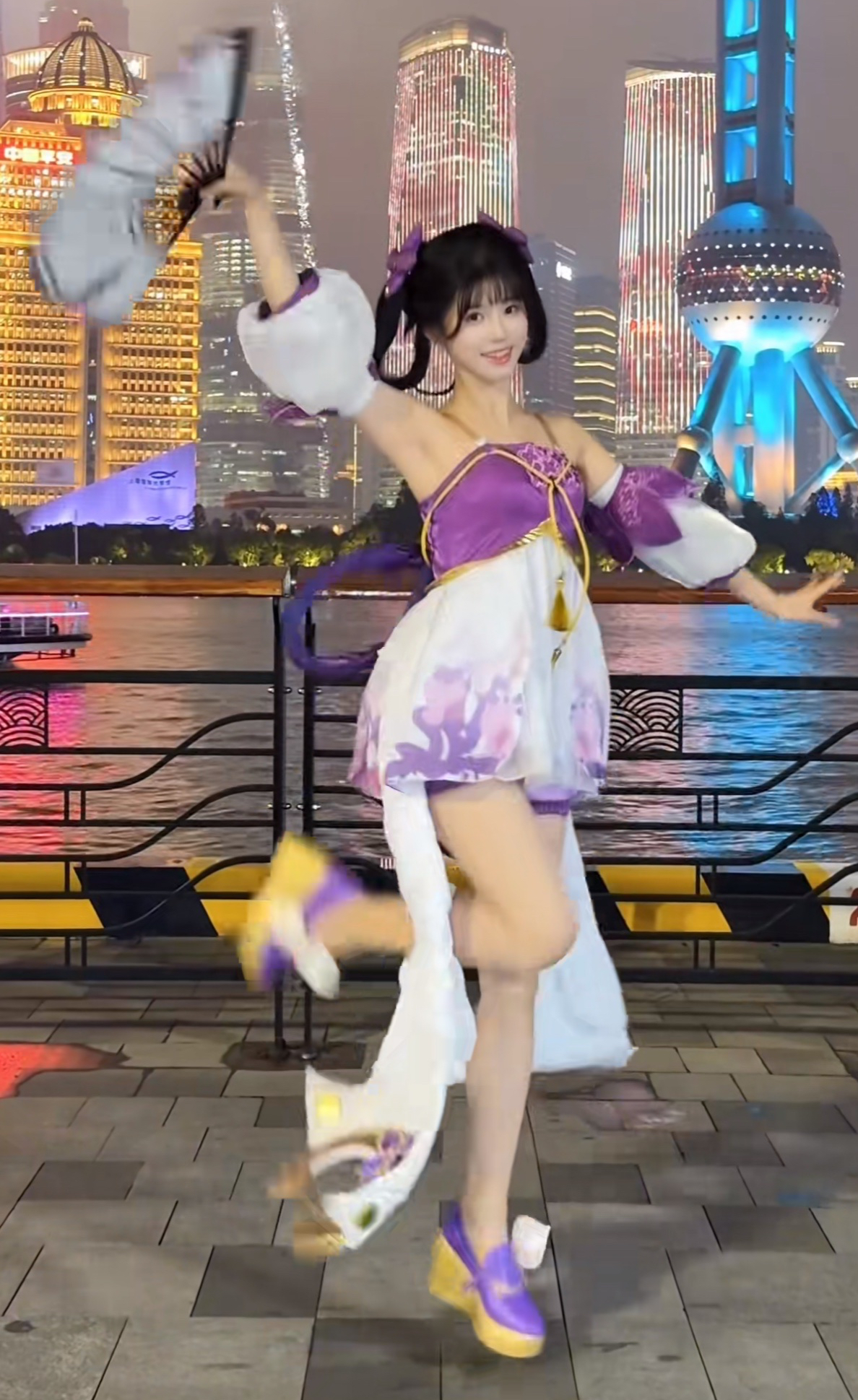 近期她在东方明珠前面拍摄的一组小乔丁香结皮肤,形象就很美丽。能看到她身穿一身白紫色的衣裙,裙子长度也并不长,头上的头发不是假发,而是她自己的头发,然后挽了2个丸子头,头上还扎着一对紫色的发夹,搭配她紫色的高跟鞋,这个造型还是很还原的。