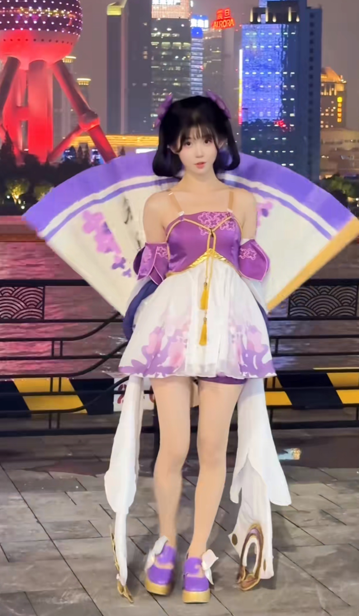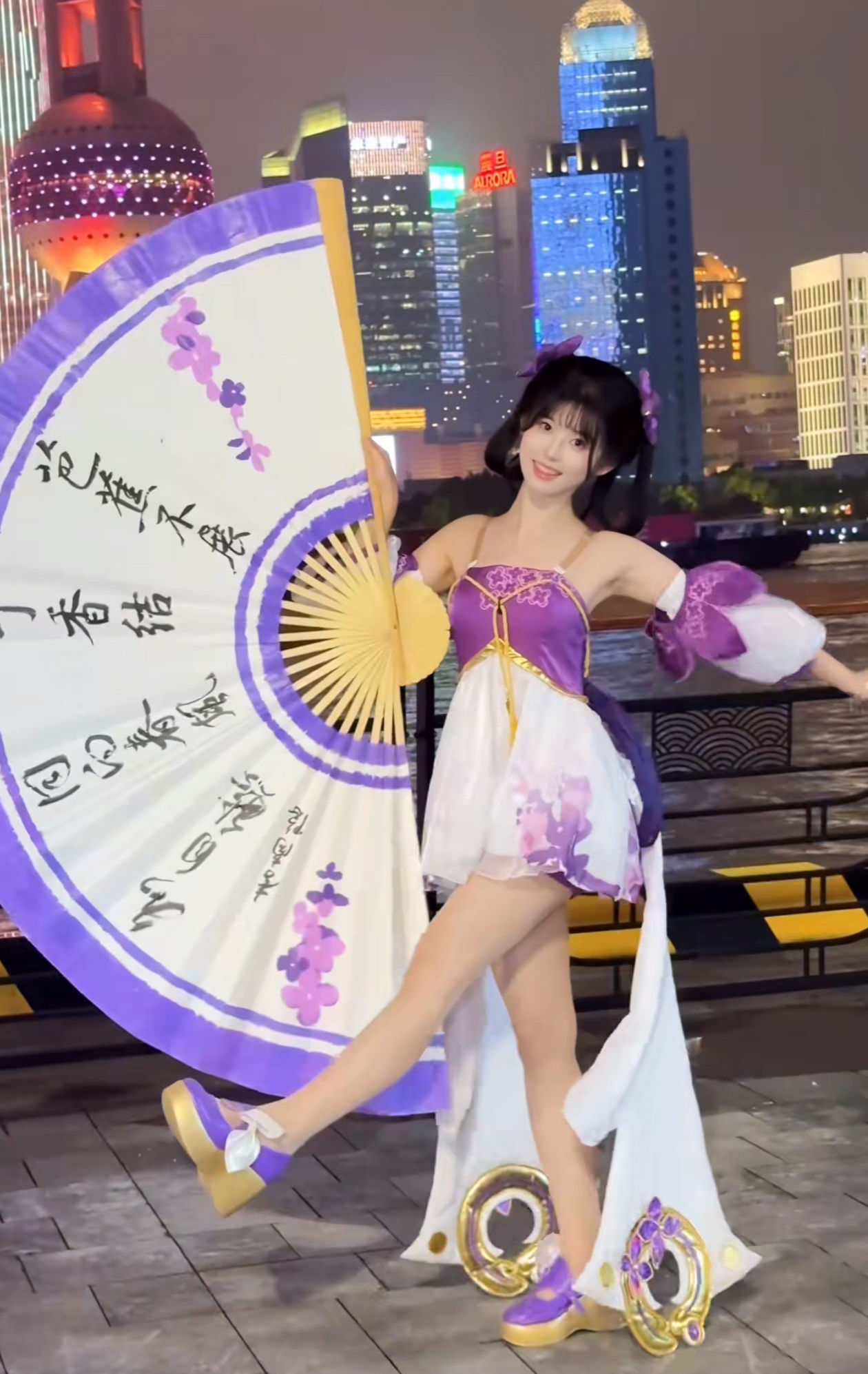 毕竟不是专业的,所以她的发型方面巨帅特别还原,但是其他方面是很还原的,而且,她手中还拿着一把大大的扇子,这个扇子也是白紫色的,上面用毛笔字写着一些字还有紫色的玫瑰花,看起来很不错。
