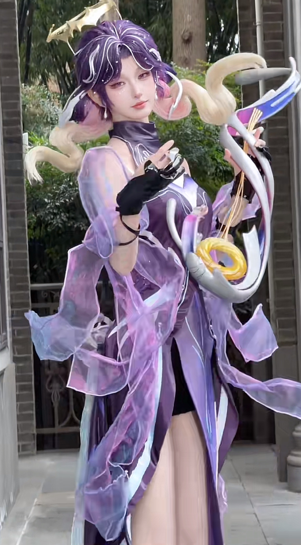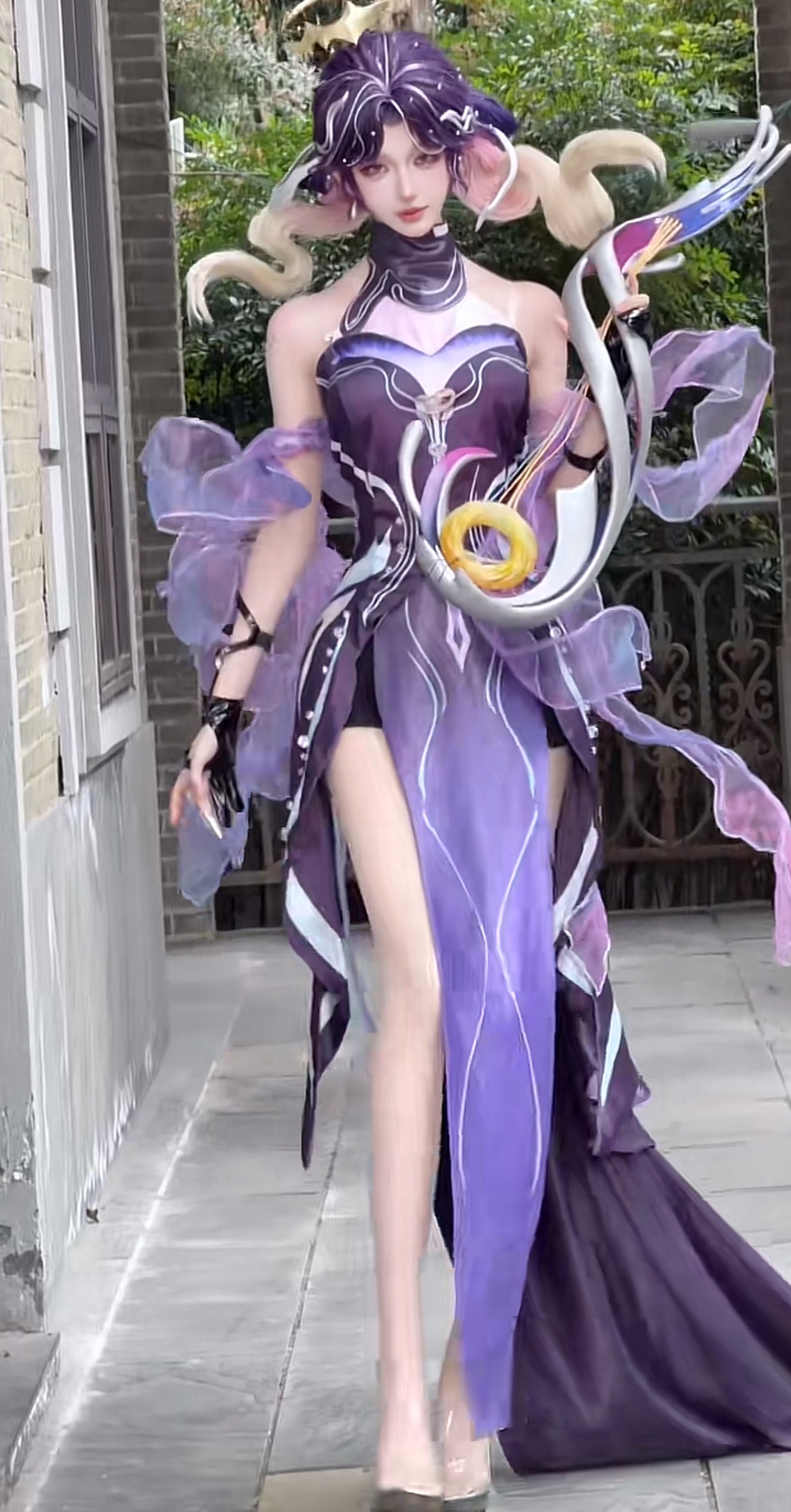 而且,她头上还有白色的发丝,看起来造型也是那么独特的。并且,她这个裙子的长度不长,但是这刚好显示出了她的优势,她的腿又细又白而且还长,走起路来就和专业模特一样,非常的有气质。并且,为了更加的还原造型,她手中还抱着一个紫色的琵琶,脸上还穿着高跟鞋。造型真的可以说是一比一还原了。