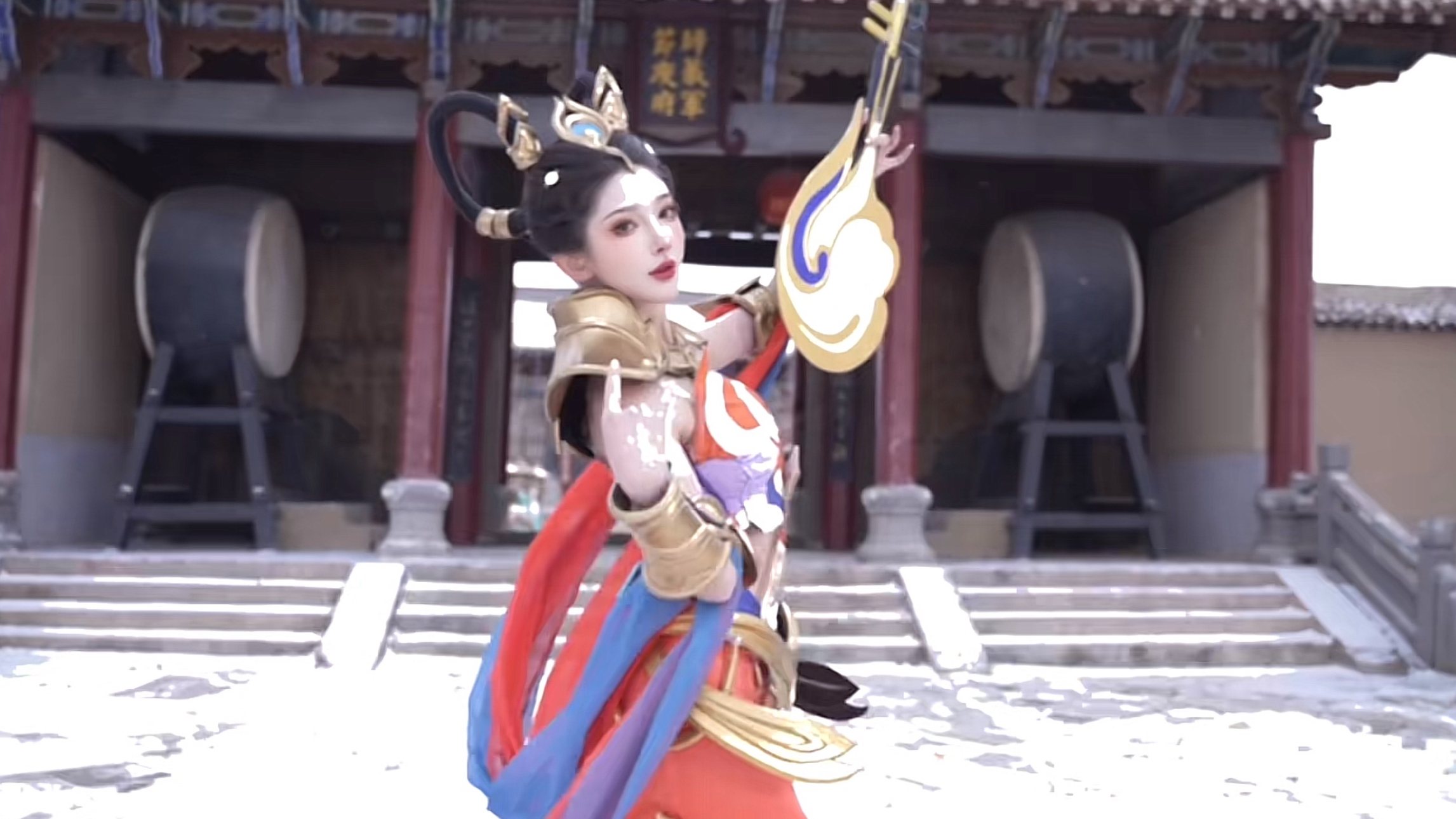 然后就是苍大佬,她曾经也cos过杨玉环,不过是杨玉环的遇见飞天,这款皮肤是杨玉环性价比最高的一款皮肤,她是王者荣耀和敦煌联动推出的皮肤,整个皮肤都有敦煌元素,这款皮肤中杨玉环就是神女。