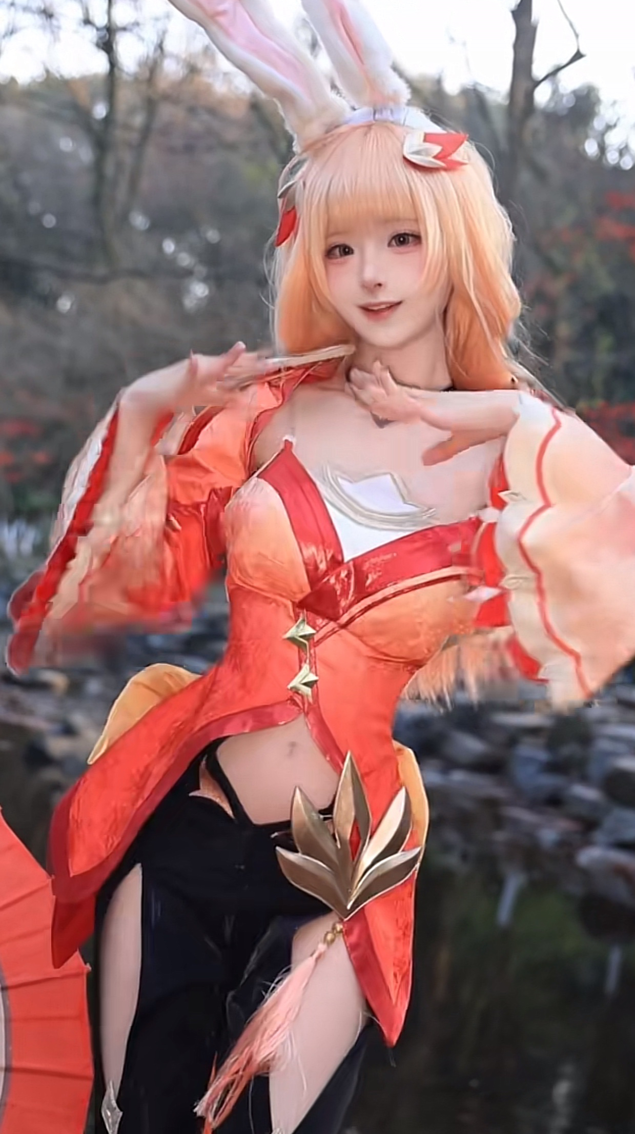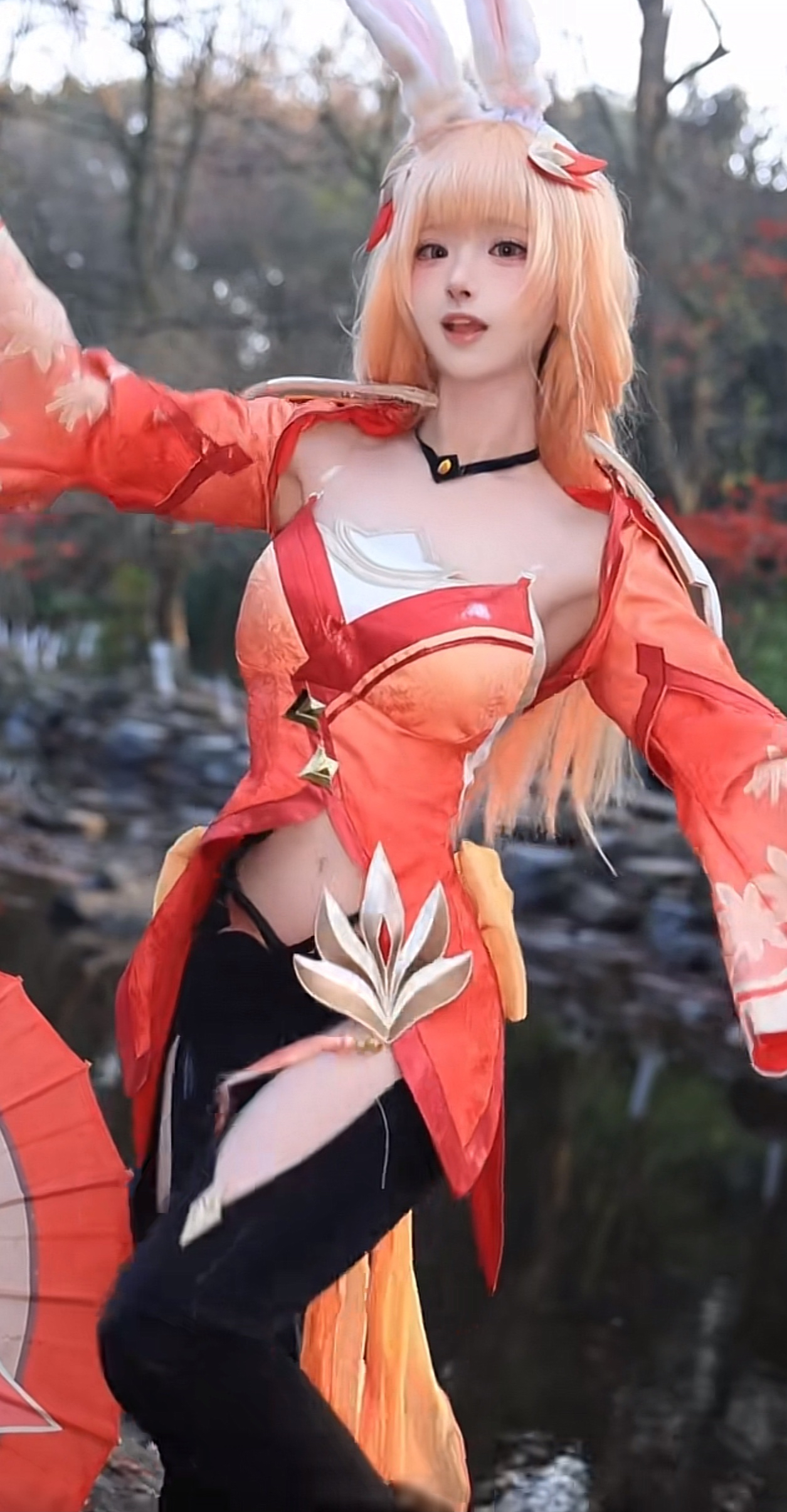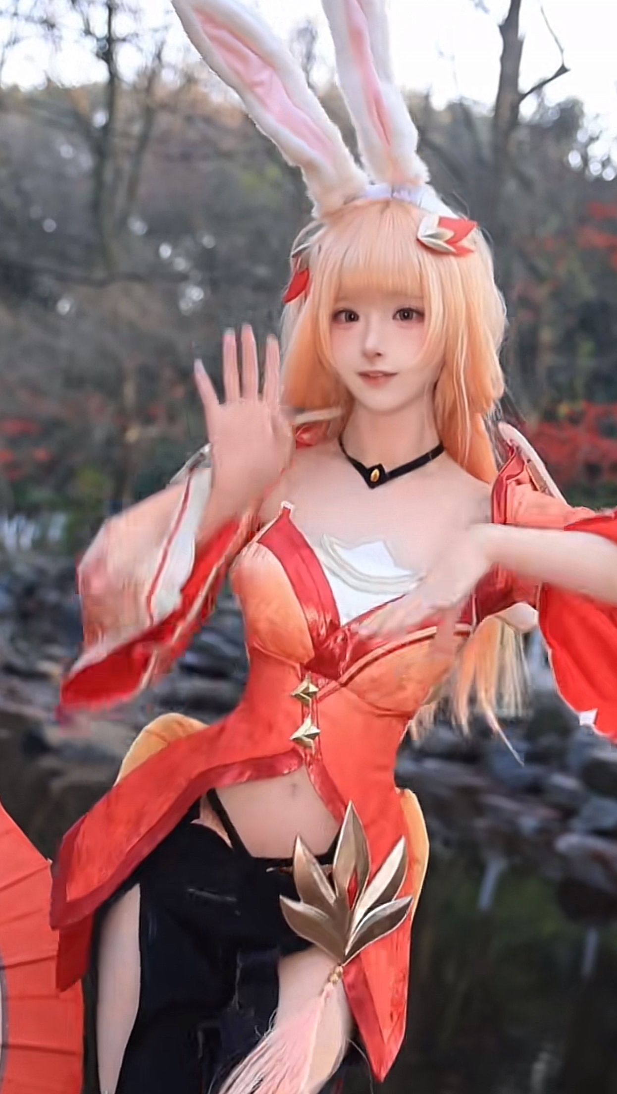 能看到她身穿一身绿色的上衣,下身是那种紧身的黑色绑腿裤,搭配一头黄色的假发,头上还戴着一对白色的兔耳朵,为了造型更好看,她的假发上面还扎着一个红色的枫叶发夹,特别的完美。