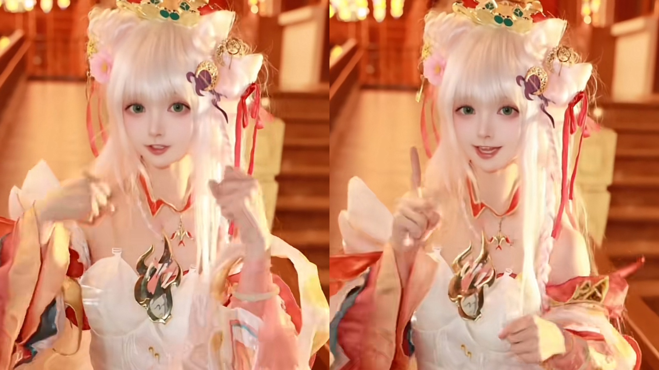如下图所示,这位博主cos的是西施的情人节限定皮肤,博主身穿一身古风长裙,一头白色长发,造型也是非常的好看。