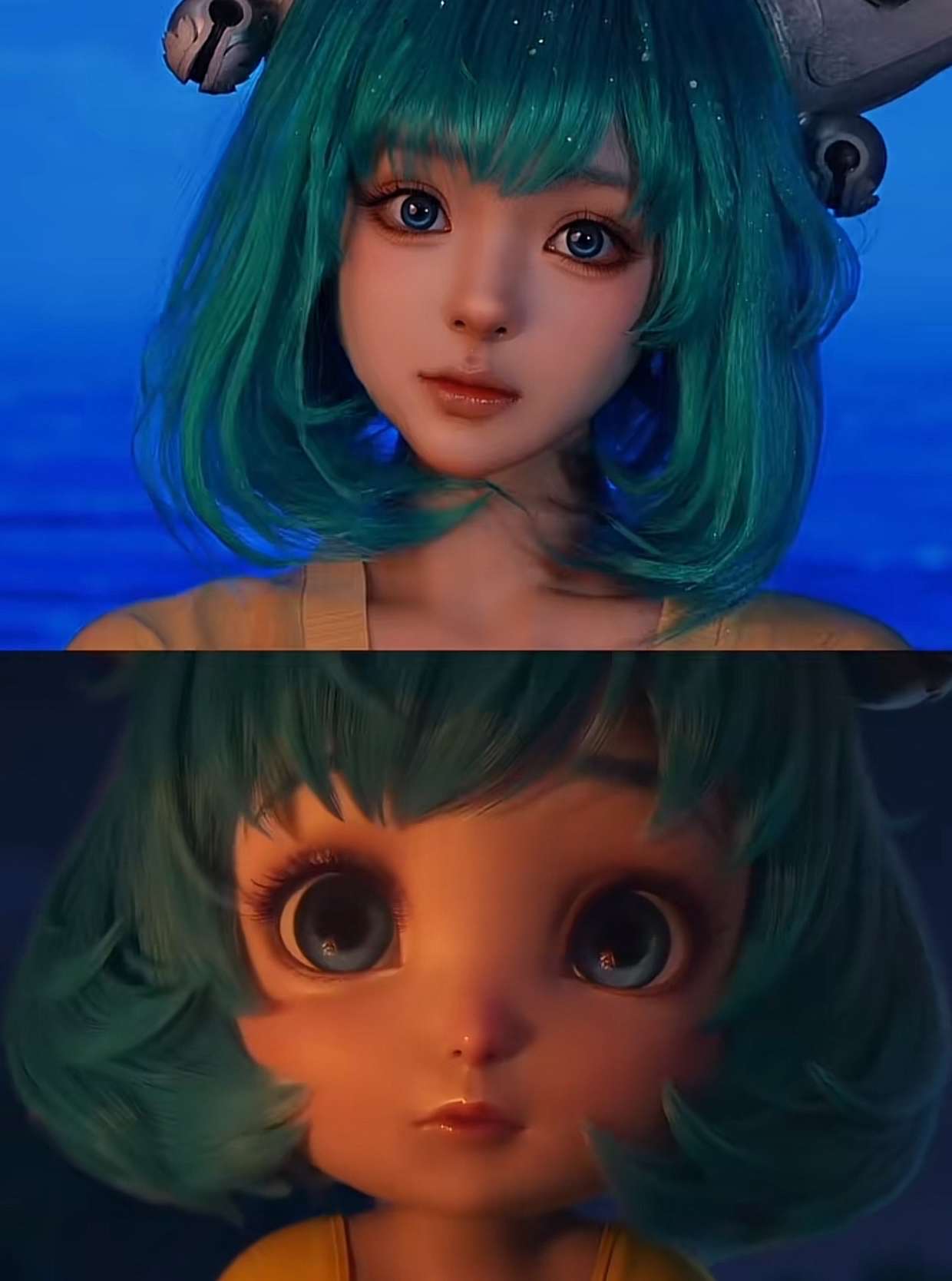 能看到她头上戴着一头绿色的短发,发型还是那种娃娃头,加上大大的眼睛,真的很可爱。